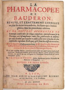 Pharmacopoeia - BAUDERON, Brice - La pharmacopee de Bauderon (...) augmentée [de l'Appendice, par Gratien Bauderon, du Traité des eaux distillées, par Laurens Catelan, du Traité chimique, par G. Sauvageon] (...). Avec la Réponse au "Vindiciae...