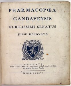 Pharmacopoea Gandavensis nobilissimi senatu jussu renovata. Ghent, J. Begyn, 1786 4to, cont. calf (somewhat rubbed), gilt orn. spine on 5 raised bands (head and tail repaired), red edges, [10]-466-[1] pp. (spotting throughout, somewhat soiled). Good copy. Very rare. The last Ghent pharmacopoeia and at the same time the last one published in the southernmost part of the Low Countries, presentday Belgium (Daems & Vande Wiele, pp. 107 - 108). Text in Latin, names of the Materia Medica translated in Dutch. Woodcut on title. Ex-libris Petri Josephi Evrard Pharmacopoeae on first flyleaf.