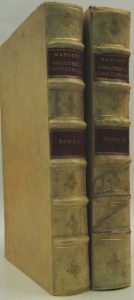 2 vol., folio, mod. vellum, gilt spines on 6 raised bands, red leather labels, [20]-938, [4]-904 pp. (brown. throughout, engr. of pl. 4 in vol. II cut out and pasted on). Good copy (usual spotting). Very rare famous collected ed. by the Swiss physician in Brandenburg service, J.J. Manget (1652-1742). Geneva issue (another issue with “Coloniae Allobrogum" in the imprint). "The most complete collection of alchemical texts ever published, containing 140 treatises (...). For the historian of chemistry this is the most important and indispensable work” (Duveen). Engr. ills : full-page portrait by J.G. Sciller after Guillibaud and 30 full-page pl. (complete : n. 1-15 + 1, I-XIV). The last text is titled "Mutus liber" and consists of 15 beautiful pl. of hieroglyphic figures explaining the Hermetic philosophy. General title in red and black. Woodcut mark on titles. Printed in 2 cols. Ownership entries crossed out on titles.