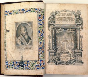 folio, cont. blindst. calf over wood (rubbed, sl. wormed), edges bevelled inside, spine on 5 raised bands (head & tail dam.), metal catches (clasps gone), [36]-1492-[60] pp. (paper age-toned, sm. wormtracks and single wormholes in last quires, final blank loose). Very good copy. The last and most extensive of all Plantin Press editions of the great botanical encyclopaedia by Rembert Dodoens (1517-1585).  Illustrated  with a nice engr. title with medallion portraits of Dodoens and Clusius and some 1430 woodcut ills of plants and herbs. Cont. engr. portrait of Dodoens pasted on verso of half-title, facing title, and surrounded by a cut-out border from a 15th-c. illuminated manuscript with coat-of-arms (blackened).