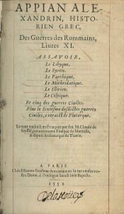 Antiquity - APPIANUS, Alexandrinus - Des guerres des Rommains [!], liures XI. (…). Et cinq des guerres ciuiles. Plus le sixiesme desdictes guerres ciuiles, extraict de Plutarque [trsl. from the Greek Claude de Seyssel]. Paris, (R. Avril for) E....