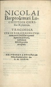 Antwerp imprint - theatre - BARTHELEMY, Nicolas - Christus Xylonicus. Tragoedia. Cum ob Rom. sermonis puritatem, tum ob sanctissimi argumenti dignitatem, in theatra, in scholas, in bibliothecas ultro accersenda. Antwerp, Wid. M. de Keyser for J....
