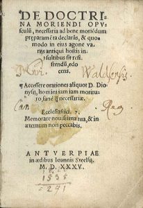 Antwerp imprint - CLICHTOVEUS, Jodocus - De doctrina moriendi opusculu(m), necessaria ad bene morie(n)dum preparame(n)ta declara(n)s (…). Accessere orationes aliquot D. Dionysii (…) necessariae. Antwerp, (J. Grapheus for) J. Steelsius, 1535