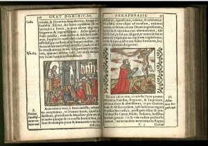 16mo, later vellum, flat spine, gauffered edges, [48]-471-[9] pp. (some minor staining). Very good copy.   Very rare ed. of a popular collection of Latin prayers by the Brabant priest and teacher S. Verepaeus (1522-1598). Woodcut ill. on title. Some 98 woodcuts in text, many old coloured. Title and calendar in red & black. Printed within ruled border.