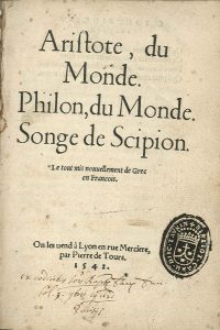 ARISTOTELES - Aristote, du Monde. Philon, du Monde. Songe de Scipion [trsl. from the Greek]. Lyon, P. de Tours, 1542