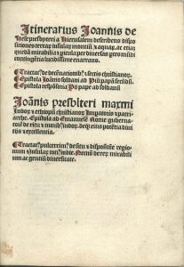 4to, mod. wr., [20] ff. Excellent copy, rubricated throughout. Very rare early ed. (1st 1490) of a famous fictitious travel account to the Holy Land and further. It survives in 5 mss. (1424-) and 11 early printed eds (1490-1565), often with revisions. “In a similar vein with Mandeville’s travels, Hesse’s work provides the reader with a fantastic and extremely engaging narrative - he encounters cannibals, pygmies, and a unicorn; sees a parting of the sea, which enables him to reach a holy shrine; finds and visits the Garden of Eden; and spends a significant amount of time visiting the legendary (and mythical) Prester John in his oriental palace.” (Reese). It is above all a record of how a northern European might have imagined Asia during the later Middle Ages. Blank capital spaces.