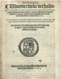 Dutch Revolt - Bruges - Wreede Turcksche, wonderlijcke verhalinghe van dit leste verraet, voorghenomen tegen Ducks Dangin [pen correction: Dangiu] onsen gheduchtighen Heere/ ende teghen den Eedelen Prince van Orangien/ gheschiet binnen Brugghe desen...