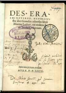 ERASMUS - Hyperaspistae liber secundus aduersus libru(m) Martini Lutheri, cui titulum fecit Seruum arbitrium. Basel, J. Froben, 1527