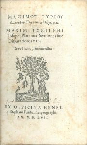id. 2 works in 1 vol., 8vo, old English calf (somewhat worn), spine on 5 raised bands (broken, head and tail def., joints split, front cover loosening), [8]-363 (= 263)-[1], [16]-320 pp. (quires I-L bound in wrong order; some sl. spotting). “Editio princeps of the 41 Greek dissertations (...) by the itinerant Platonist lecturer Maximus of Tyre, reputed to have been the teacher of Marcus Aurelius” (Schreiber). The Latin trsl. was 1st publ. Rome 1517. Woodcut mark on titles. Capital spaces with guide-letters. Old name on title "Jacobus Janssonius". Collector’s stamp.
