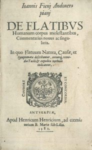 FIENUS, Joannes - De flatibus humanum corpus molestantibus, commentarius nouus ac singularis. In quo flatuum natura, causae, et symptomata describuntur, eorumque remedia facili & expedia methodo indicantur. Antwerp, (Jan van Ghelen for) Henricus...
