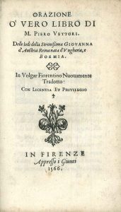 Florence imprint - VETTORI, Pietro - Orazione o' vero libro (...) delle lodi della Serenissima Giovanna d'Austria Reina nata d'Vngheria, e Boemia. Florence, Giunti, 1566
