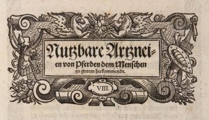 [20]-235-[45] pp. [bound with] FAYSSER, Johann - Hippiatria. Gründlicher Bericht vnd aller ordennlichste Beschreibung der bewerten Rossärtzney. Das erste Buch darinnen von den inwendigen (...) Kranckhaiten des Leibs (...) gehandlet. Ibid., 1576, [13]-154 (= 155)-[2] ff. (some quires age-toned, 1st ff. somewhat stained or spotted, some marg. dampstaining, 1st title underlaid and with margins strengthened, bottom edge of I3, L1, Q2 and V5 and fore-edge margin of K2 repaired with sellotape, right corner of 2nd title torn off and underlaid with loss of part of woodcut border, last f. underlaid), 2 works in 1 vol., folio, cont. blindst. pigskin over wood (expertly repaired, sm. def. at lower cover), covers with many blindst. rolls and head-in-medallion portraits, spine on 4 raised bands, metal clasps and catches (1 clasp gone). Good copy. 1. Rare 2nd ed. (1st 1570) of the 2nd translation/adaptation into German of Grisoni’s “Ordini di cavalcare” (Naples 1550). Double-page circular woodcut indicating 75 diseases inserted between Z6-7, 88 full-page woodcuts (some repeats), including 6 of a standing horse and 1 of a horse’s skull, 16 illustrating horse training and dressage, 22 plans relating to horse training etc. Title in red & black within elaborate woodcut border with portraits of famous riders. Printed music on pp. 227-228. Old ownership entries on front endpaper (‘Erasmus a Dietrichstein LB Labag’ and ‘Claudii Schneeweiss ab Arnoldtstein | nunc autem Eiusdem filij Joannis Jacobi’). Ref. VD-16 G-3372. Menessier I:581. Cp. Dejager 62-64 (ext. descr. of eds 1570, 1580, 1599). 2. Extr. rare treatise on diseases and accidents of the horse and their treatments. Full-page woodcut arms of dedicatee (Georg Friedrich zu Brandenburg) on verso of title. Full-page woodcut portrait of Faysser (Fesser) on b5v. Title in red & black within elaborate woodcut border. Some pp. within border of type ornaments. Ref. VD-16 F-670. STC German (BL) 299. Not in Dejager, Durling, Wellcome.