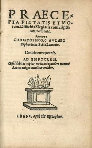 Neolatin poetry - Frankfurt imprint - AULAEUS, Christophorus - Praecepta pietatis et morum, distichis elegiacis conscripta. Frankfurt a. Main, Chr. Egenolff, 1551