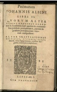 Neolatin poetry - Leipzig imprint - ALBINUS, Johannes - Poematum (...) libri II. quorum alter versus continet heroicos in Academia Lips. partim in conuentibus publicis pronuntiatos, partim in gratiam praecipuorum virorum compositos; alter...