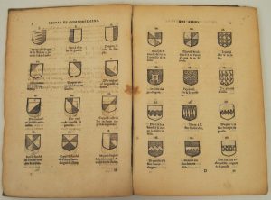 folio, cont. vellum (sl. rubbed), flat spine (def.), [11-1 bl.]-88 (=107 )-[1] pp. (large brown spots on title and A2, prelim. ff. spotting, some dampstaining, sm. wormtrack in upper margins, errors in pagination). First ed. of this heraldic and genealogical work by Scohier (1530-1609), canon of Berghes. Ill. with 114 woodcut coat-of-arms, num. genealogical trees in text and beautiful head- and tailpcs. Woodcut printer's mark on title. Ref. Saffroy 2072. BT 4310. Machiels S-232. Not in Adams. We join : Menestrier, Claude-François, S.J. - La nouvelle méthode raisonnée du blason, pour l'apprendre d'une manière aisée (...). Lyon, Bruyset, 1734, 12mo, cont. calf (corners sl. bumped), gilt orn. spine (sl. rubbed, def. at head, upper joints sl. splitting). Engr. front. and 31 full-page pl. Bookpl. i.a. comte de Nedonchel. Ref. Pettegree FB 47546 = NB 27683. Saffroy 2204. DBS V 937 n. 127. (2 vol.)