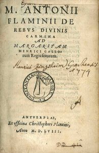Plantin Press - FLAMINIUS, M. Antonius - De rebus divinis carmina ad Margaritam Henrici Gallorum regis sororem [and: In librum Psalmorum brevis explanatio ad Alexandrum Farnesium Cardinalem]. Antwerp, Chr. Plantin, 1558