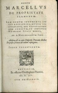 Plantin Press - NONIUS MARCELLUS - De proprietate sermonum (...) restitutus (...) industria Hadriani Iunii (...). Additus est in calce Fulgentij Placiadae libellus De prisco sermone ab eodem repurgatus. Index vocabulorum. Antwerp, Chr. Plantin, 1565