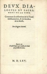 SUREAU, Hugues - Deux dialogues du sacrement de la Cene. Contenans la refutation de la Transsubstantiation, & du sacrifice de la Messe. Orléans, E. Gibier, 1565