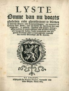 4to-size, mod. boards or wr. (some staining). In good condition. 1. Voorghebodt noopende de wynen. B. Manilius, 1649, [12] ff. 2. Instructie (...) impositien (...) op saut, visch, ende harinck. Wid. & Heirs J. vanden Kerchoven, 1670, [8] pp. 3. Ordonnantien (...) t’Recht vande maelderye van het graen. Ibid., 1671, [6] ff. & 1688, [10] ff. 4. Ordonnantie ende reglement op’t stuck vande munte. Ibid., 1672, [6] ff., a.o.