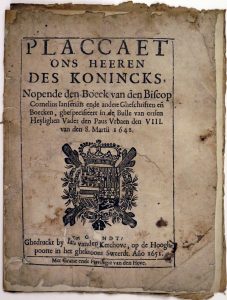 Various sizes. Generally in good condition. I.a 1. Announcement of the sale of the former "Casteel van Hansame" and various other properties in "Veurn-Ambacht", [S.l.s.n., 1618], broadsheet. 2. Placcaet ons Heeren des Konincks, nopende den Boeck van den Biscop Cornelius Jansenius, Ghent, J. vanden Kerchove, 1651, 4to, [6] ff. (t.-p. underlaid & repaired). 3. Joannes Hessels, Catechismus, Louvain, B. Masius, 1654, 4to (inc.). 4. Diversche goederen te coope (...) binnen de Prochie van Boesinghe (...) Vormesele (...) Vlamertinghe, Ghent, H. Saetreuwer, 1685. 5. Reglement pour le prix des Eaux de Vie qui se consommeront dans les cantines des domaines de Flandre, [S.l.s.n., 1700], broadsheet, in French with Dutch addition for the "Casselrie van Ypre". 6. Declaration de guerre de Louis XIV. contre (...) Le Duc de Savoy, [S.l.s.n., 1703?], 4to, 8 pp. 7. Vrye feeste vande stede van Cortryck, [Kortrijk, s.n., 17th/18th c.?], broadsheet. 8. Hoogpointers ende vry-schepenen der Casselrye van Cortryck, Kortrijk, J. de Langhe, 1778.