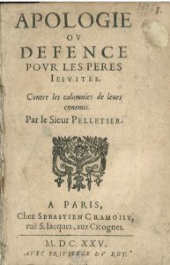 Jesuits - PELLETIER, Thomas - Apologie ou Defence pour les Peres Iesuites contre les calomnies de leurs ennemis. Paris, S. Cramoisy, 1625