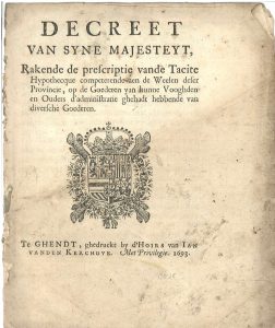 4to, loose, sewn or mod. boards. Voorghebodt nopende de wynen der stede van Ghendt / ghemaeckt ende ghepubliceert de xviiste en xviiiste. daghen van februario zesthienhondert neghene (...). Ghent, B. Manilius, 1649, [23-1 bl.] pp. (dampstaining throughout, upper corner of title repaired, lower corner of last f. lacking). - Verdobbelinghe van het recht vanden segel, ghestatueert by de reglementen vanden 30. april, ende 29. julij 1671 (...). Ghent, wid. and heirs J. Vanden Kerchove, 1671, [7-1 bl.] pp., 2 copies. - Transactie aengegaen tusschen syn hoogweirdigheyd den bisschop van Gendt, ende d'edele heeren van het Hoofd-collegie van den Lande van Waes nopende de pastorele rechten. S.l., s.n., [1692], [4] pp. - Decreet van syne majesteyt, rakende de prescriptie vande tacite hypothecque competerende aen de weesen deser Provincie, opde goederen van hunnen vooghden en ouders d'administratie ghehadt hebbende van diversche goederen. Ghent, heirs J. Vanden Kerchove, 1693, [8] pp. Ref. Bibl. gantoise 924, 998, 1179. STCV (except "Transactie").We join : Confirmation du Roy de la confrererie de St. Ivon, patron de la justice. Ghent, heirs J. Vanden Kerchove, s.d. [1684], 4to, sewn, 8 pp. (dampstained, sm. repairs). Ref. Bibl. gantoise 983. - Motif van rechte omme d'heeren pastoors der stede van Ghendt, appellanten ter eender zyde ieghens d'eerw. vrouw abdesse vande Bylocke. S.l., s.n., s.d., 4to, mod. boards, [2]-16-pp. Ref. Not in Aleph UGent, STCV. (7 pcs)