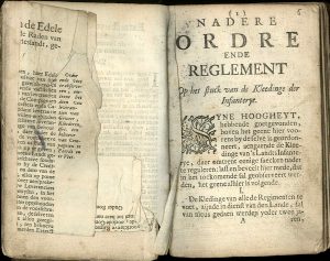 8vo, cont. limp vellum (stained), flat spine (somewhat soiled and dampstained, some thumbing or traces of use, bottom corner of 1 f. torn off with sm. loss of text, imprint of nr. 19 lost). Armorial bookpl. Mark Dineley. In good condition. 1. Recueil van de militaire ordres van sijne Hoogheyt den Heere Prince van Orange, [1674?], 16 pp. (different ed. from those in STCN). 2. Articulbrief ofte Ordonnantie op de discipline militaire, 1705, 16 pp. 3. Ordre ende reglement (...) by de regimenten te voet, 1681, 7-[1] pp. 4. Nader ordre ende reglement (...) van ’s Landts Militie, 1684, 8 pp. 5. Extract uyt de Resolutien van (...) Gecommiteerde Raden (...) genomen op den 14. December 1684, [s.l.s.n.], 1 f. (folded). 6. Nadere ordre ende reglemente op het stuck van de kleedinge der Infanterye, [1687], 8 pp. 7. Reglement op de proceduren der militairen, [s.l.s.n., 1687], 8 pp. 8. Nadere ordre ende reglement voor de Engelsche ende Schotsche regimenten, [1687], [4] ff. 9. Ordre ende reglement (...) op de wachten, 1688, 14-[2] pp. 10. Geredresseerde ordre op de exercitie van de militie, den 6. September anno 1688, 87-[1] pp. 11. Tractaet tusschen (...) Vranckryck, ende de (...) Vereenighde Nederlanden, aengaende het wisselen ende rantçoeneren der gevangenen, 1691, 22-[2] pp. 12. Sommiere instructie voor den hoogen Kryghsrade, 1700, 8 pp. 13. Ordre ende reglement (...) by de regimenten te voet, 1701, 8 pp. 14. Ordre ende woorden van commando, op de hangelinge van de snaphaen, 1701, 22-[2] pp. 15. [Willem III], Syne Majesteyt (...), [s.l.s.n., 1701], [2] ff. 16. Nader ordre ende reglement ... op het logement en verteeringe van de militie, [s.l.s.n., 1704], 8 pp. 17. Reglement (...) omtrent de insubordinatie, 1706, 32 pp. 18. Nadere ordre (...) voor de militie, 1716, 32 pp. 19. Lysten hoedanigh de volgende compagnien te paard, dragonders en te voet (...), 1718, 4to, 10-[2] pp.