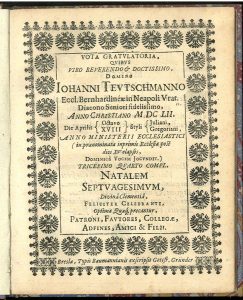 Neolatin poetry - Breslau imprint - Vota gratulatoria quibus (...) Iohanni Teutschmanno Ecclesiae Bernhardineae in Neapoli Vrat. Diacono (...) anno Christiano M DC LII. (...) natalem septuagesimum (...) celebranti (...) precantur patroni...
