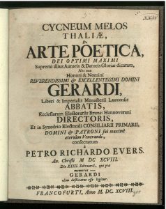 Neolatin poetry - Germany - EVERS, Petrus Richard - Cycneum melos Thaliae, De arte poetica (...) consecratum (...) die XXIII. Februarii. Frankfurt a. Main, s.n., 1698