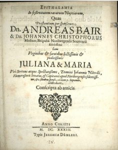 Neolatin poetry - Nürnberg - Epithalamia in festivitatem rararum nuptiarum, quas praestantium par sponsorum, Dn. Andreas Bair & Dn. Johannes Christophorus Molitor, Reipubl. Noribergensis Secretarii (...) cum (...) Juliana & Maria viri (...) Johannis...