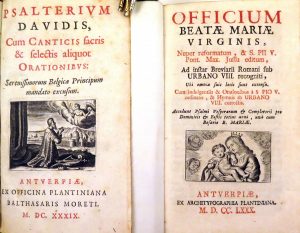 8vo, later giltruled sheep, gilt orn. flat spine, yellow edges, mod. slipcase, 604-[8] pp. (margin of p. 401 repaired). Plantin Press ed. of the Psalms. Engr. ill. on title. Printed in red & black. 19th c. ownership entry on endpaper "J.B. Trubert". Ref. BCNI 9253. Not in STCV, Opac KBR. - Officium Hebdomadae Sanctae secundum Missale & Breviarium Romanum (...). Antw., Plantin Press (Balthasar I Moretus, Wid. of J. Moretus & J. Meursius), 1619, 24mo, old leather (rubbed, front cover loosening), 402 pp. (lacking final f. with Privilege); some thumbing, quires O cut short and loosening). Good copy. Very rare pocket "officium" for the Holy Week. Engr. ill. on title + 5 engr. ills in text. Printed in red & black thoughout. Ownership entries. Ref. BCNI 6668. Anet (1). Not in STCV, Opac KBR, Simoni (BL), BnF etc. We join : Officium beatae Mariae virginis, nuper reformatus, & S. Pii V. (…) editim (…). Antw., Plantin Press, 1780, 12mo, old sheep, spine on 4 raised bands, clasps and catches pres., a.e.g., mod. slipcase, [48]-720-4-pp. 721/736 pp. (minor spotting). Nice 18th c. liturgical publication. Engr. ills : 1 on title and 17 full-page engragings. Num. woodcut initials. Printed in red and black throughout. Ref. STCV. Not in Opac KBR. - Missale Romanum, Ex Decreto Sacro-sancti Concilii Tridentini restitutum, S. PII V. Pont. Max. Iussu editum, Et Clementis VIII. primùm, nunc denuò Urbani Papae VIII. auctoritate recognitum. Antw., Plantin Press (Moretus), 1695, [bound with] Missae propriae Sanctorum Ecclesiae Cathedralis Antverpiensis (...). Antw., Plantin Press (Moretus), 1684, 12-[1-1 bl.]-2-[1-1 bl.]; [and] Missae Novae in Missali Romano (...) Antw., Plantin Press 1749, 40 pp., 3 works in 1 vol., 8vo, later embossed leather, spine on 5 raised bands, gilt edges, tabs (some def.), [64]-632-cxxiiii-[4] pp. (some marg. stains, corner of last ff. gnawed at., text in red & black in 2 cols. music in the text, woodcut ills : historiated initials col. & black throughout, endpcs in red, 10 full-page pls. Ref. Cp. STCV. (4 vol.)