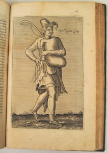2 vol., cont. calf (sl. rubbed), double gilt ruled border on covers, spines on 5 raised bands (splitting, corners repaired), [8]-907-[1 bl.-27] pp., [6]-196-[11-1 bl.] pp., [4]-89-[3] pp., 273 col.-[3 pp.], 116-[3] pp. (some browning and spotting; large, rather faint waterstain in 2nd vol. touching some pls, several pl. with tears : p. 808 in the 1st vol.; pls 28, 38, 57, 61, 97, 111 and p. 1 in the 2nd vol., some of the tears touching the pl., some of them underlaid or repaired with los of the picture). Rare collected ed. with additions by Th. Artus (1st 1632) based on the French trsl. of the Latin text by Blaise de Vigenère. This ed. contains many further additions to the orig. text of Chalcondyles by François de Mezeray bringing the history up to date (1649) (Atabey). With 2 engr. titles (outside margins of both cut short), 1 map "La ville de Constantinople", 1 fold. pl. "Portraict de l'armée de l'empereur Turc rangée en bataille", 24 Sultan-portraits (19 in vol. I and 5 in vol. II) and 79 full page pl. (inspired by the 16th c. engravings in Nicolay's works) of which 68 depicting fine costumes of Turkish warriors, noble men, a turkish cook as well as local costumes of Malta, Adrianople, Alger etc. and 17 allegorical engr.