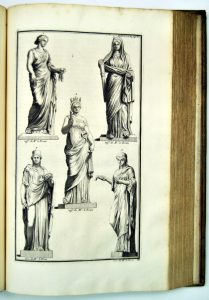 5 parts in 9 (of 15) vol., folio, cont. mottled calf (corners sl. bumped), gilt orn. spines on 6 raised bands (sm. def., joints sl. rubbed), gilt red leather title labels, gilt inner dentelles, [8]-civ-194, [4]-pp. 195/452, [2]-267-[1 bl.], [4]- pp. 269/472-[2 bl.], [2]-198, [2]- pp. 199/390, [2]-174-[2]-pp. 177/316, [2]-168, pp. 169/437-[1 bl.] pp. (minor spotting, III : hole in headpc. p. 269, V : right margins sl. staining, VI : sm. hole in pl. 184, VII : tear of +/- 10 cm in pl. 72 & 81, part 4 bound in 1 vol.). Good, large paper set. First edition of this work on classical archaeology by B. de Montfaucon (1655-1741), Benedictine of the Congregation of Saint-Maur and one of the founders of modern archaeology. From 1698 to 1701 he lived in Rome. He established his reputation with this 15-volume work published between 1719 and 1724. It contains "Les Dieux des Grecs & des Romains" (pt I/a), "Les Heros parvenus à la Divinité" (part I/b), "Le Culte des Grecs & des Romains" (pt II/a), "La religion des Egyptiens, des Arabes, des Syriens, des Perses (...)" (pt II/b), "Les habits, les meubles, les vases, les monoyes, les poids (...)" (pt III/a), "Les bains, les mariages, les grands & les petits jeux, les pompes" (pt III/b), "La guerre, les voitures, les grands chemins, les ponts, les aqueducs, la navigation" (pt IV/a), "Les chemins publics, les aqueducs, & la navigations" (pt IV/b), "Les funerailles, les lampes, les supplices" (pt V/a), "Les funerailles des nations barbares, les lampes, les supplices" (pt V/b). Without the 5 supplementary vol. (Paris, 1724). It is a vast pictorial encyclopedia with copious engravings of the gods, heroes, religious customs, architecture, military practices, domestic habits, and funerary rites of the ancient world. Engr. ills : 10 title-vign., portrait by J. Audran after N. Largillière, 5 headpieces, 976 (of 977) pls (of which 144 double-page, 1 unnumb. pl. in part 3 lacking ?). Titles in red & black. Libr. stamps and armorial bookpl. removed. Stamp Aug. Duchesne Rheims.