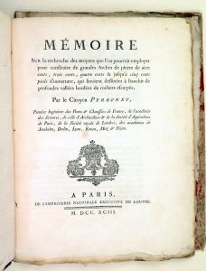in-4, cart. papier marbré de l'époque (frotté, coins abîmés, dos manquant), 44 pp. Bon ex.  Edit. originale fort rare de ce précieux mémoire du célèbre ingénieur français Perronet (1708-1794), qui fut le premier directeur de l'Ecole des Ponts et Chaussées. On lui doit la construction de plusieurs ponts, le canal de Bourgogne et plusieurs grands ouvrages parisiens. Complet de la grande planche dépl. hors texte, 63 x 77 cm : "Plan, profil et élévation de la moitié d'une arche en plein cintre de 500 pieds d'ouverture (...)".
