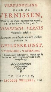 8vo, cont. sheep (rubbed, front joint split), gilt spine, marbl. endpapers, 16-218-[26] pp. Good copy. Extr. rare Dutch trsl. of a treatise on Chinese (and Japanese) varnishing and lacquer wares by the Italian Jesuit scholar Buonanni (1638-1725), "Trattato sopra la vernice detta Cinese" (Rome 1720). It was soon translated in French ("Traité des vernis", Paris 1723). Ill. with 4 folding engr. pls. Title in red & black.