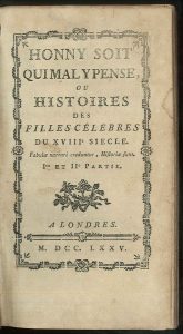 Curiosa - JULLIEN, Jean-Auguste dit Desboulmiers - Honny soit qui mal y pense, ou Histoires des filles célèbres du XVIIIe siècle. Londres, s.n., 1775
