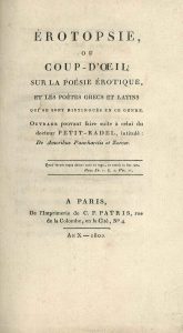 Curiosa - PETIT-RADEL, Philippe - Erotopsie, ou Coup-d'oeil sur la poésie érotique, et les poètes grecs et latins qui se sont distingués en ce genre. Ouvrage pouvant faire suite à celui du Dr Petit-Radel, intitulé "De Amoribus Pancharitis et...