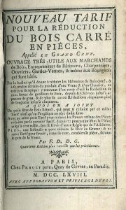 12mo, cont. marbl. boards (rubbed, spine def.), 74-[2] pp. (clear dampstain in 1st half). Good copy. 2nd ed. (1st 1758) of a price list for the glass trade, with details on formats and prices as approved by the "Manufacture privilégié des Glaces". Old ms. list pasted on lower endpaper. Collector's stamp Samain. Ref. Higgs "Bibl. economics 1751-1775" 3413. BnF (2). Cp. Conlon "Lumières" 58:292 (1st ed.). Not in BL.Joined : Nouveau tarif pour la réduction du bois carré en piéces, appelé le Grand Cent. Ouvrage très-utile aux marchands de bois, entrepreneurs de bâtimens, charpentiers, ouvriers, gardes-ventes, & même aux bourgeois qui font bâtir (…). Par F.D.D.G. [4th ed.]. Paris, Prault père, 1768, 12mo, cont. marbl. calf (rubbed), gilt flat spine, 168 pp. (some marg. soiling). Good copy. Very rare price list for the wood trade, sometimes ascribed to "Desclos". Old names on front endpaper and flyleaf. Ref. Not in Higgs, Conlon, BL, BnF (3rd ed. of 1757 only). (2 vol.)