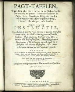 Economy - EVERSDYK, C.F. - Pagt-tafelen, waar door alle on-ervarene in de reken-konste seer veerdig en gereed, konnen calculeren de pagt, huere, onkost, en koop van lande (...). Mitsgaders eene grondige instructie om (...) te vinden een yders...