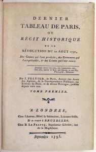 France - French Revolution - PELTIER, Jean-Gabriel - Dernier tableau de Paris ou Récit historique de la révolution du 10 août 1792, des causes qui l'ont produites (...) et des crimes qui l'ont suivies. "A Londres, chez l'auteur (...) et se trouve...