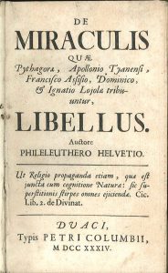 Jesuits - miracles - ZIMMERMANN, Johann Jakob - De miraculis quae Pythagorae, Apollonio Tyanensi, Francisco Assisio, Dominico, & Ignatio Lojolae tribuuntur libellus (...) [by] Phileleutherus Helvetius. Douai, P. Colombius, 1734