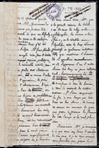 Suivent encore de nombreux passages justificatifs. Une bande latérale de papier transparent recouvre les débuts de lignes de la première page sans gêner la lecture.