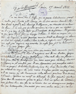 l'abbé Gerbet (5), à un «cher ami» (4), à M. Le Cudennec (5), à M. Waille (1); il y a aussi deux reçus dont l'un signé trois fois; les numéros 394-399 sont des fragments autographes de Lamennais chiffrés arbitrairement: «Calorique «, [«Sur la vieillesse «], «Essai sur l'indifférence en matière de religion, chapitre