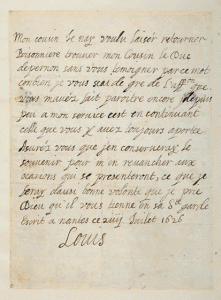 LOUIS XIII Le roi Lettre autographe signée Louis à Louis Nogaret d'Épernon dit le cardinal de la Valette. Nantes, 14 juillet 1626; une page in-4 agrandie au format in-folio par greffe de papier.
