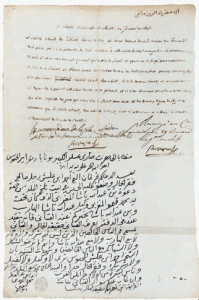 Le cheik Muhammed-el-Muhdi demande au général Bonaparte la libération d'un coreligionnaire détenu pour une «prétention de caffé». Bonaparte a écrit de sa main, au bas de la traduction: «Le commandant de la place fera sortir le dit homme et mettre en liberté».