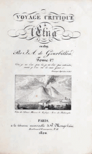 GOURBILLON I. A. de Voyage critique à l'Etna en 1819. Paris, P. Mongie l'aîné, 1820. 2 vol. in-8, brochés (état moyen). En tête du 1er vol.: Reproduction d'une inscription syriaque; en tête du second vol.: Carte; sur les deux vol.: vignette du...