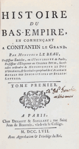 LE BEAU (Charles) Histoire du Bas-Empire en commençant à Constantin le Grand. Paris, Desaint et Saillant, 1757-1817. 28 vol.(sur 29) in-12, pleine reliure rouge. Ex-libris Tronchin; 27 volumes de texte et 1 volume de Table (en deux parties). Incomplet.