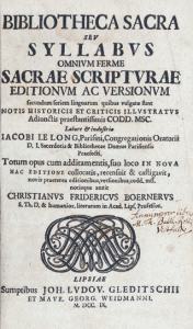 LE LONG Jacques; BOERNER Christian-Frédéric Bibliotheca sacra seu Syllabus omnium ferme Sacrae Scripturae editionum ac versionum. Leipzig, J. L. Gleditch et M.G. Weidmann, 1709. 1 vol. in-12, vélin (état moyen, dos de la reliure arraché).