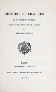 MACLER Frédéric Histoire d'Héraclius par l'évêque Sebeos. Paris, Leroux, 1904. 1 vol. in-8, demi-reliure à coins, tranches dorées.