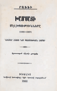 RAFFI Le Mélika de Khamous (1600-1827). Tiflis, Gouvernement du Caucase, 1882. En arménien oriental. 1 vol. in-12, demi-reliure. Réimpression d'une série d'articles dans Mechak.